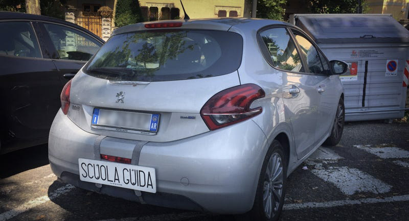 This is one of my favorite parking moments, for so many reasons. It’s a car from the driving school (the one John and I took driving lessons from, which is a whole other story…). This parking lot was full, so the driving school instructor decided to park illegally in front of the trash dumpsters. What isn’t in the photo is that there is a huge lot right next to this one that is nearly empty, but you have to pay 70 cents to park there. Clearly, it’s much better to ignore the no-parking zone and park in front of the dumpster.